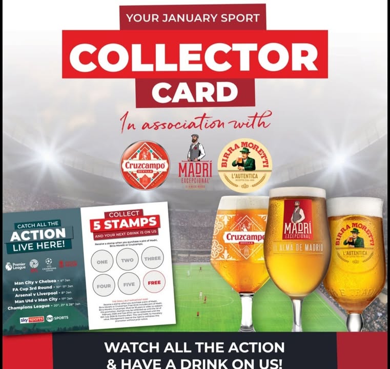 We have so much football on this weekend!! Starting at 12.15 with Everton v Sunderland! We've also got our collector cards - buy 5 pins or either Cruzcampo or Birra Morretti and get the 6th for free!! We've also got free Coors as well - just ask the team for details!!